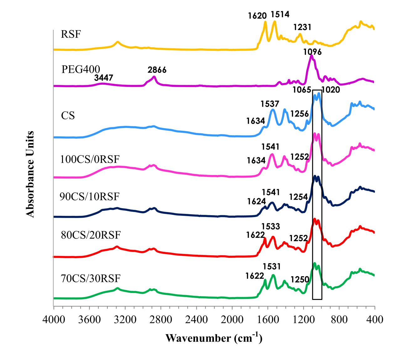 The CS film without PEG400 exhibited absorption band at 1634 cm-1 (C=O stretching), 1537 cm-1 (NH2 stretching), 1256 cm-1 (O-H bending), 1065 cm-1 and 1020 cm-1 (C-O stretching) [36, 46, 62]. In addition, PEG400 showed characteristic absorption band at 3454 cm-1 (O-H stretching), 2866 cm-1 (C-H stretching) and 1095 (C-O-C stretching) [63]. Interestingly, 100CS/0RSF film showed NH2 peak shift from 1537 to 1541 cm-1 and O-H peak shift from1256 to 1252 cm-1 suggesting H-bonding between-OH of PEG400 with-NH2 or-OH of CS.