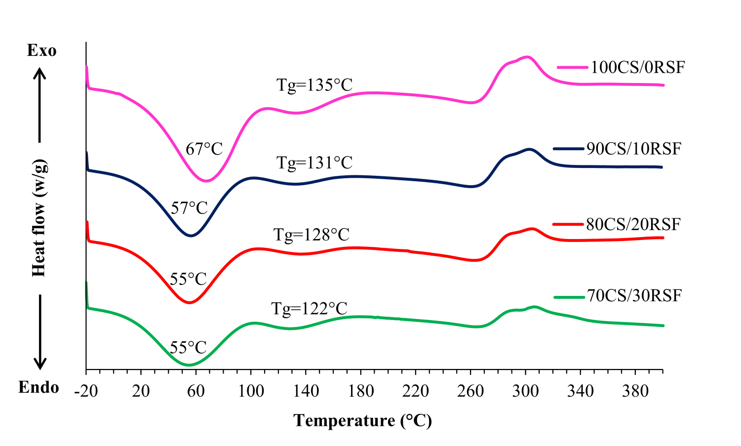 Thermal properties of CS/RSF films were investigated by DSC measurement as shown in fig. 3. Water evaporation temperature, glass transition temperature (Tg), thermal decomposition temperature were investigated. A broad endothermic peak below 110 °C observed in all CS/RSF films was attributed to moisture evaporation. With increasing RSF content, the height and area under endothermic peak were decreased indicating the reduction of moisture in the films. This observation correlated to the water content of the film, the water content of CS/RSF films decreased with increasing RSF content, table 3.