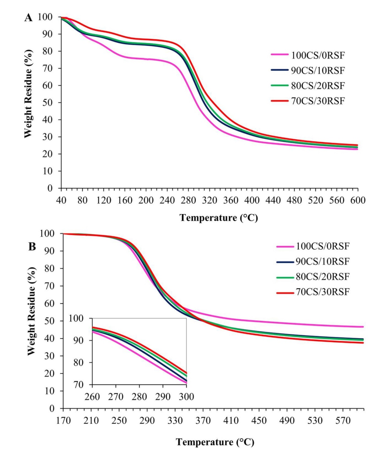 In addition, the thermal properties of the blended film were also confirmed by TGA. The initial weight loss of CS/RSF films at below 170 °C, ∼5-20%, was due to water evaporation (fig. 4A). In accordance with DSC results, the moisture content of CS/RSF films decreased with increasing RSF contents. However, to determine the effect of RSF content on thermal decomposition temperature, the TGA curves of CS/RSF films were adjusted to avoid the interference from the moisture (fig. 4B). The thermal decomposition temperature of CS/RSF films was ∼ 260-330 °C similar to DSC results. At the thermal decomposition temperature, the residual weight of CS/RSF films slightly increased with increasing RSF. This indicated that increasing RSF slightly increased the thermal stability of CS/RSF films. Furthermore, both DSC and TGA techniques revealed that all CS/RSF films possessed high thermal stability with the thermal decomposition temperature of >260 °C. This confirmed that CS/RSF films were able to be autoclaved at 121 °C without deterioration.