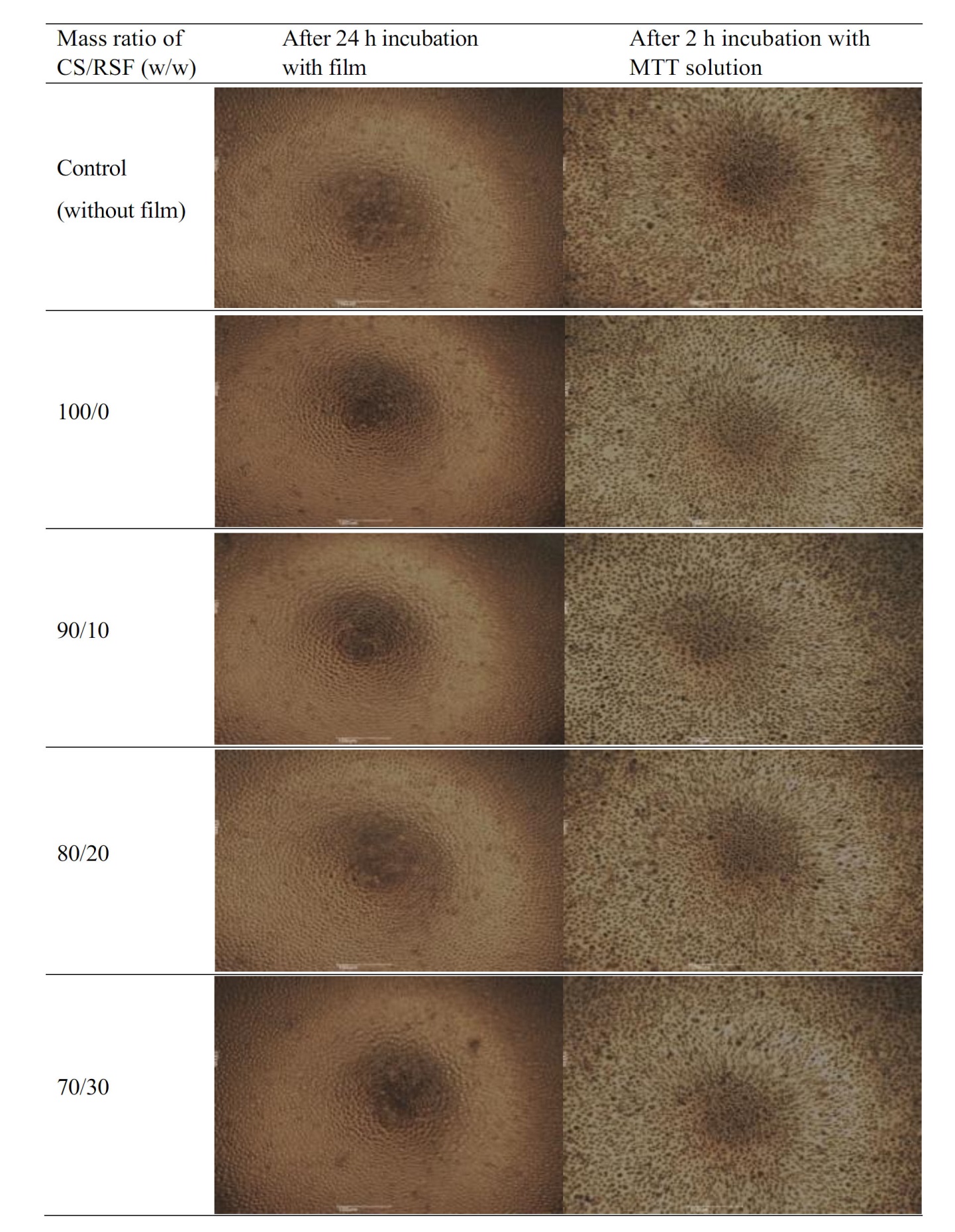 The cell viability of HCECs after incubation with CS/RSF films for 24 h was approximately 100% (see fig. 6) indicating that CS/RSF films are non-cytotoxic. In addition, non-cytotoxicity of CS/RSF films was further confirmed by microscopic observation (table 5). Upon treatment with CS/RSF films, the appearance of confluence HCECs showed no significant difference as compared to those treated without CS/RSF films (control). Similarly, after they were incubated with MTT, the appearance of HCECs treated with CS/RSF films showed similar morphology as those of control.