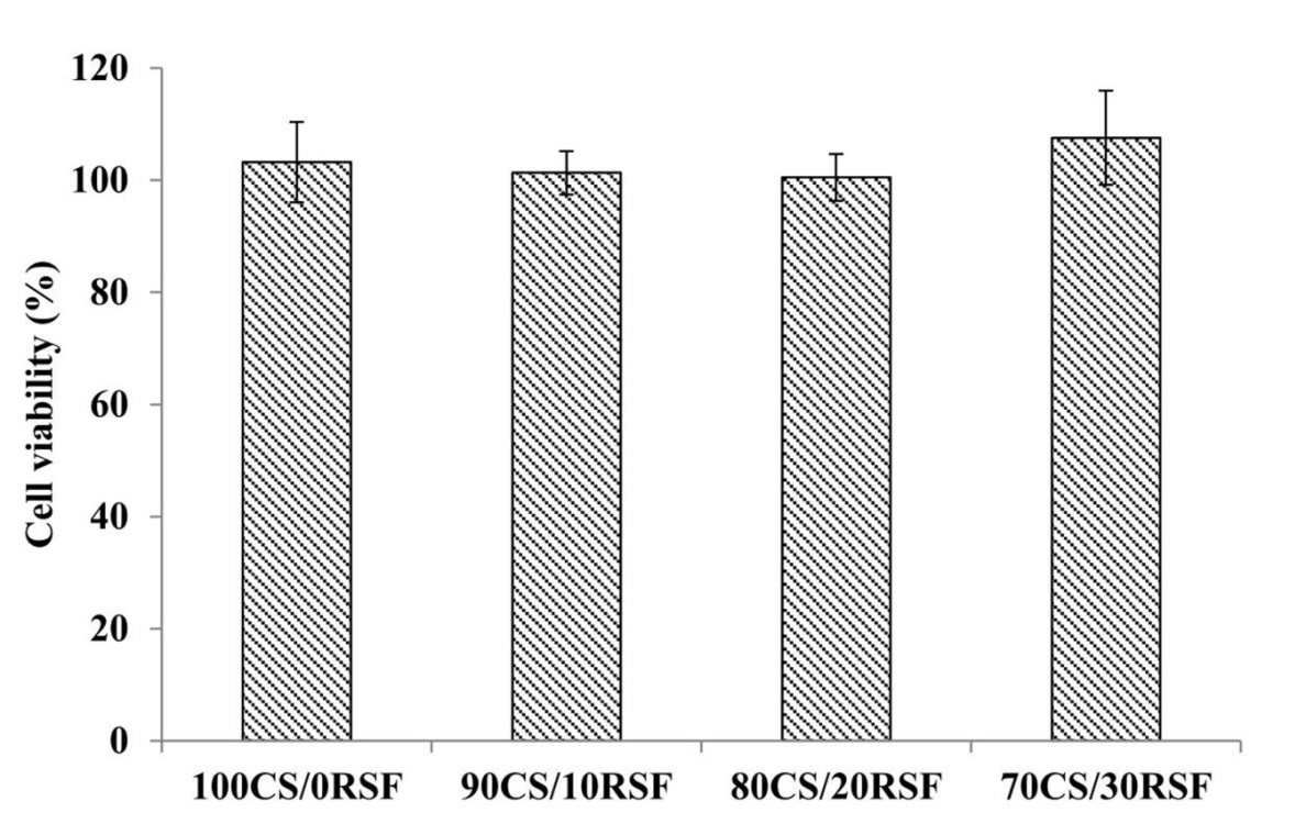 Fig. 6: Cell viability of HCECs after exposed to CS/RSF films for 24 h, error bars indicate SD for n = 3