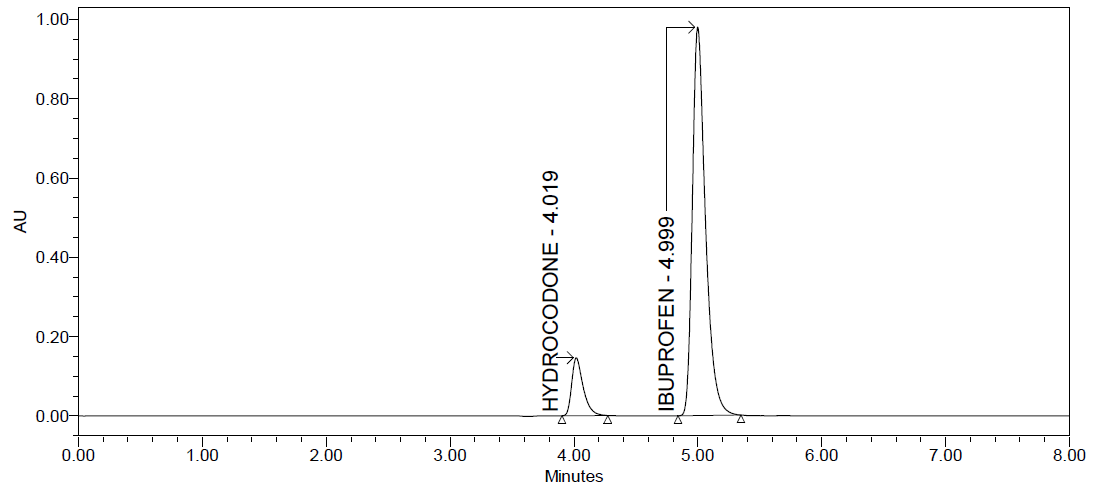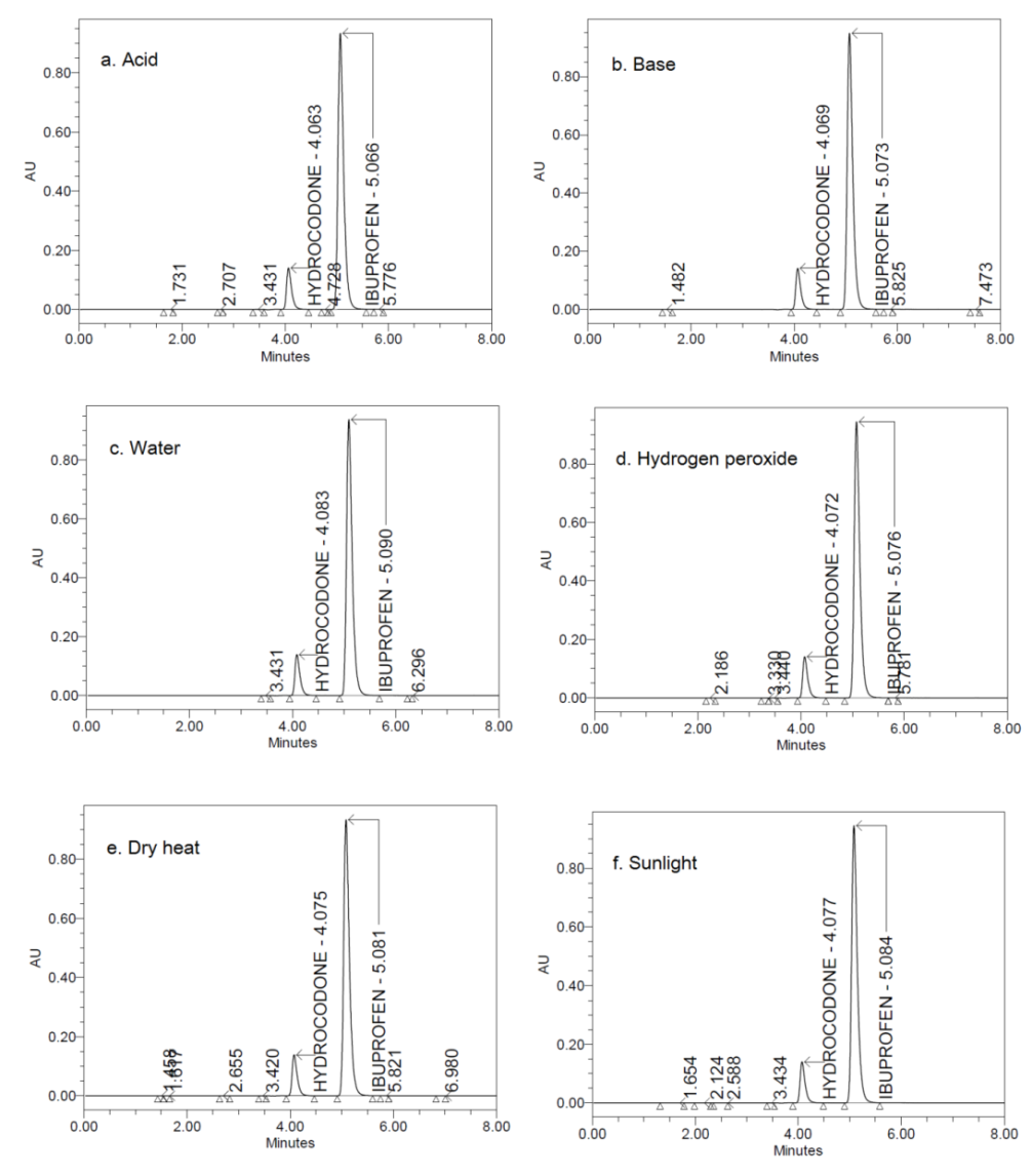 After treatment with 0.1N NaOH, hydrocodone and ibuprofen showed 2 degradation peaks with retention times of 1.482 min and 5.825 min. The percent degradation of hydrocodone and ibuprofen were 1.04 % and 15.9%, respectively. Following treatment with 0.1N HCl, hydrocodone and ibuprofen showed 5 degradation peaks with retention times of 1.731 min, 2.707 min, 3.431 min, 4.728 min, 5.776 min. The percent degradation of hydrocodone and ibuprofen were 3.28 % and 1.26%, respectively. On hydrolysis with water, hydrocodone and ibuprofen showed 2 degradation peaks with retention times of 3.431 min and 6.296 min.