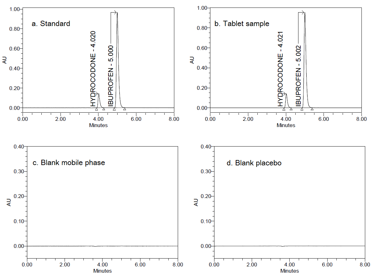 During selectivity testing, chromatograms of standard (7.5 µg/ml hydrocodone and 200 µg/ml ibuprofen), tablet sample (7.5 µg/ml hydrocodone and 200 µg/ml ibuprofen), blank mobile phase and blank placebo were screened for probable interference. No potential interfering peaks were observed at the retention times of hydrocodone and ibuprofen in the blank mobile phase and placebo chromatograms, hence the method is proved selective (fig. 3).