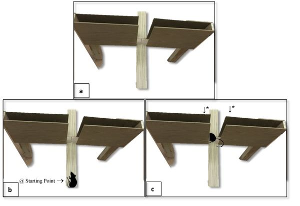 Fig. 1: Elevated plus maze device; fig. 1a: The maze is a wooden device consists of central platform 10 x 10 cm with 10 x 50 cm two open arms and two 10 x 50 x 40 cm closed arms with an open roof. Fig. 1b: Rats were individually placed at the distal end of the open arm (@) at T20 min, T30 min and T40 min. Fig. 1c: time taken for the rat entering to either of the closed arm (*) was recorded