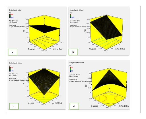 According to equations (7) and (8), the positive coefficient of XC reveals that increasing the speed of rotation increases the PDI of both noisome and spanlastics. This is due to the formation of a thin uniform lipid layer that results in the formation of spherical vesicles upon the hydration of both vesicles which leads to increase the PDI [28].