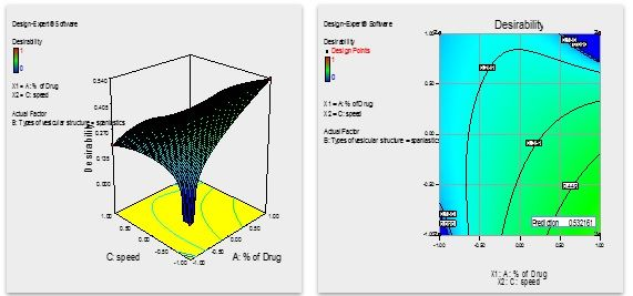 According to equation (4), the positive value of drug’s percent XA reveals that the increases of drug’s percent will lead to increase the PS of niosomes as the more increase in CBZ’s percent, the more encapsulation of CBZ into the vesicle. This is because of the probability of the interaction between the CBZ, the surfactant head groups and the interaction with cholesterol which leads to the increase of the PS. While with spanlastics the more increase the drug’s percent, the more decrease the PS due to the absence of cholesterol as shown by the negative coefficient of XA in equation (5) [27]. The negative coefficient with cholesterol of XC reveals that, increasing the speed of rotation lead to the decrease the PS of both noisome and spanlastics. This is due to the formation of a thin uniform lipid layer result in the spherical vesicles upon the hydration of the vesicles [28]