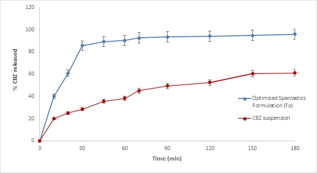 Fig. 6: In vitro release profiles of CBZ from the optimized spanlastics formulation (F0) and CBZ suspension in phosphate buffer pH 6.8 (The results are mean±SD, n=3)