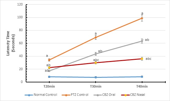 Animals groups received either saline, intraperitoneal PTZ, oral CBZ or intranasal CBZ. Latency time was recorded after 20 min, 30 min, and 40 min after PTZ administration. The rats in the normal control group (group I) reached the closed arm at T20 min, T30 min, and T40 min within a latency of 8.125, 7.916, and 8.25 seconds respectively. Rats injected with PTZ (group II) displayed a delay in latency time by 319 % at T20 min this delay was due to the small tremors (score 1) that started 10 min after PTZ administration. However, after 30 min (score 2) and 40 min (score 3), PTZ injected rats demonstrated some clonic convulsions which resulted in a further delay in latency time by 9.35 and12 folds, respectively compared to the normal control group. The administration of either oral CBZ (group III) or intranasal optimized formulation F0 (group IV) improved latency time compared to untreated rats. However, the effect of the intranasal dosage form was more pronounced resulting in a 31% decrease in latency time at T30 min and 43% at T40 min compared to the oral dosage form. Values are expressed as mean±S. E (8 animals). Statistical analysis was performed using the one-way ANOVA followed by Tukey's post hoc test (P<0.05) where (a) significant difference from normal control group, (b) PTZ control and (c) CBZ oral. T20 min: latency time after 20 min of PTZ administration; T30 min: latency time after 30 min of PTZ administration and T40 min: latency time after 40 min of PTZ administration as shown in fig. 8. This is revealed to the rapid CBZ release from the optimized spanlastic formulation and the rapid absorption of the CBZ from the nasal route to reach rapidly the brain via the olfactory region.