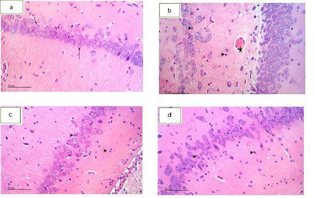 Fig. 9: Histopathological images of brain tissue sections: (a) examination of normal brain negative group showed intact neurons in the different layers (→). (b) Positive control group showed single scattered degeneration () and glial cells infiltration (). (c) Oral CBZ showed mild glial cells infiltration (). (d) Optimized intranasal (F0) showed almost intact neurons ()