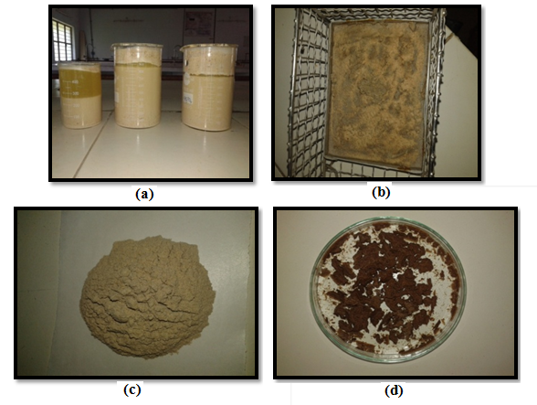 Fig. 1: (a). Sedimentation of Pigeon pea starch; (b). Separation of pigeon pea starch; (c). After drying the Pigeon pea starch; (d) Pregelatinized starch