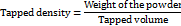 Approximately 10 g of powder was weighed and transferred into a 100 ml measuring cylinder. The cylinder was gently twisted to obtain a levelled surface of the powder. The initial volume occupied in the cylinder was noted as the Bulk density. The powder in the cylinder was then tapped 100 times at a time and the new volume occupied after each round of tappings noted as the Tapped density. The tapping was continued until no further change in volume was noted [11]. Bulk density and Tapped density were calculated using the following formula: