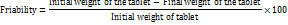 Friability is a measure of mechanical strength of the tablet. If a tablet has more friability it may not remain intact during packaging, transport, and handling. 5 tablets were measured and placed in a USP type Roche friabilator. The friability was checked at 25 rpm that is 100 revolutions for 4 min. Then the tablets were dusted and reweighed. The weight loss should not be more than one per cent [16]. The percentage weight loss (friability) was calculated as: