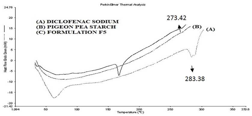 The melting point of the pure drug (Diclofenac sodium) was determined using melting point and found to be in between 250-300 °C. DSC curve obtained also shows the melting point temperature at 283.38 °C as shown in fig. 4. DSC thermogram of the physical mixture formulation containing diclofenac sodium and pigeon pea seed starch was shown endothermic peak 273.42 shown in fig. 4. Thus DSC analysis confirmed that both drug and pigeon pea seed starch were compatible with each other.