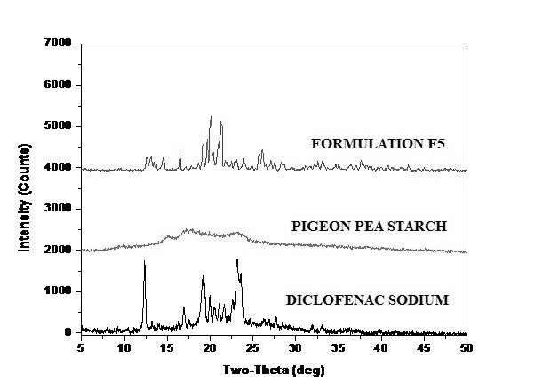 Fig. 5: X-Ray analysis of formulation F5, pigeon pea starch and diclofenac sodium