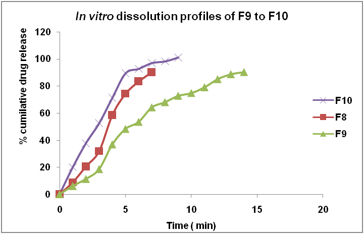The wetting time and water absorption ratio are important criteria for understanding the capacity of a disintegrant to swell in the presence of a small amount of water. The wetting time for all formulations was found to be between 58.22±0.46 to 195.12±1.62 s. The in vitro disintegration time for the formulations F1 to F10 is summarized in table 4. The in vitro drug release rate from the formulations containing natural super disintegrant was found to be rapid when compared to the formulation containing sodium starch glycolate. The in vitro drug release profile of the formulations F1 to F10 are represented in fig. 6, 7 and 8.