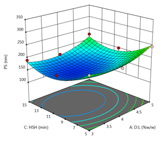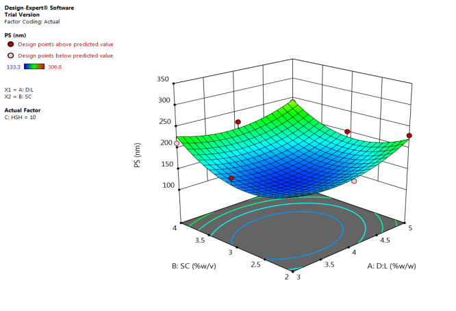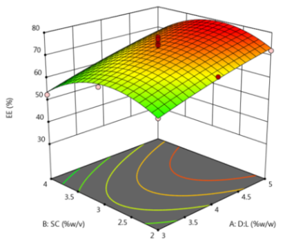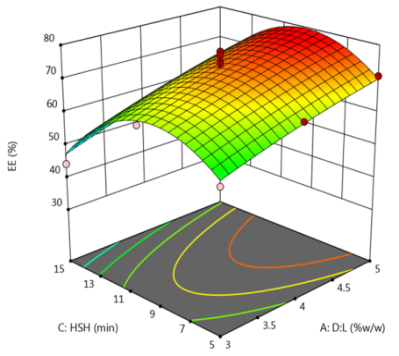The suggested quadratic model with F-value of 45.47 implies that the model is significant. The model P value was<0.0001 indicated that the model terms are significant. P values for, lipid to drug ratio was 0.0001, surfactant concentration was 0.0008 and that for hominization time was<0.0001 the results indicated there was no significant difference in %EE with the change in hominization time. The regression coefficient value R2 was 0.9534, adjusted R2 was 0.9324 and predicted R2 was 0.8971 indicating minimum variations in the experimental model. The adequate precision ratio, measuring the signal to noise ratio was 25.75 indicating an adequate signal. A ratio greater than 4 is desirable, and this model can be used to navigate the design space. The polynomial equation in terms of coded factors is given below.