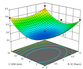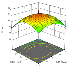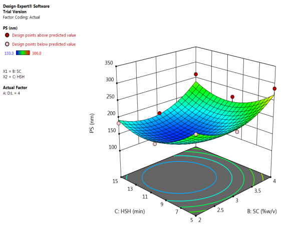 In the present work, 33 factorial designs were chosen for the optimization of CP SLN using Design-Expert software (Trial Version 11, Stat Ease Inc., and USA). 3 factors were chosen and the responses were measured at 3 levels. Totally 30runs were designed randomly. The design consisted of replicated center points and a set of points lying at the midpoints of each edge of the multidimensional cube. This defines the region of interest used to evaluate the main effects, interaction effects, and quadratic effects of the formulation ingredients, and to optimize the formulation. The quadratic model generated by the design was: