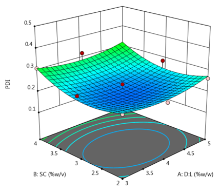 The suggested quadratic model with F-value of 44.89 implies that the model is significant. The model P-value was<0.0001 indicated that the model terms are significant. P values for, lipid to drug ratio was 0.1083, surfactant concentration was<0.0001 and that for hominization time was<0.0001 the results indicated there was no significant difference in PDI with the change in hominization time. The regression coefficient value R2 was 0.9528, adjusted R2 was 0.9316 and predicted R2 was 0.9059 indicating minimum variations in the experimental model. The adequate precision ratio, measuring the signal to noise ratio was 20.160 indicating an adequate signal. A ratio greater than 4 is desirable, and this model can be used to navigate the design space. The polynomial equation in terms of coded factors is given below.