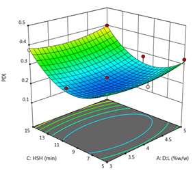 Fig. 2: 3D response surface plot for effect of lipid: drug ratio, homogenisation time and surfactant concentration on polydispersity index