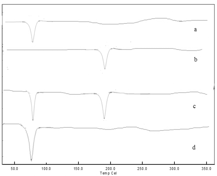 Fig. 6: DSC study. (a) Pure Compritol 888, (b) pure CP, (c) physical mixture of CP and Compritol 888 ATO (d) CP loaded SLNs
