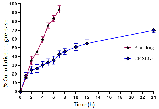 Fig. 7: In vitro drug release profile from pure CP suspension and CP loaded SLNs suspension in phosphate buffer (pH 7.4), * All values are expressed as mean±SD, n=3