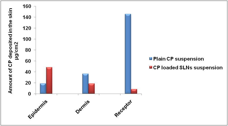 Fig. 8: In vitro skin distribution study of pure CP loaded suspension and CP loaded SLNs