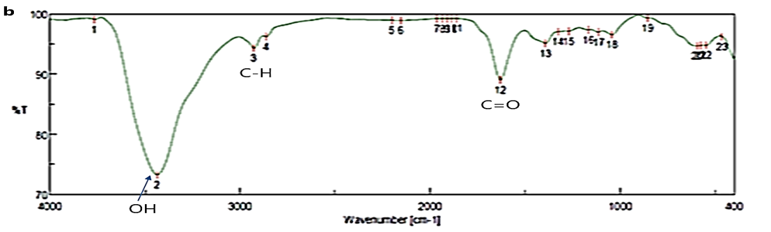 UV-vis spectroscopy is a reliable, accurate, simple, selective technique for monitoring the synthesis and stability of AgNPs. AgNPs have unique optical properties, which make them strongly interact with specific wavelengths of light. The conduction band and valence band lie close to each other in which electrons move freely. These free electrons give rise to a surface plasmon resonance (SPR) absorption band due to the collective oscillation of electrons of AgNPs [32]. The absorption of AgNPs depends on the dielectric medium, and chemical surroundings, particles dimensions, and particle size. Observation UV measurements of the formed nanoparticles showed absorbance at 443 nm for JSA AgNPs and 447 nm for JSG AgNPs.