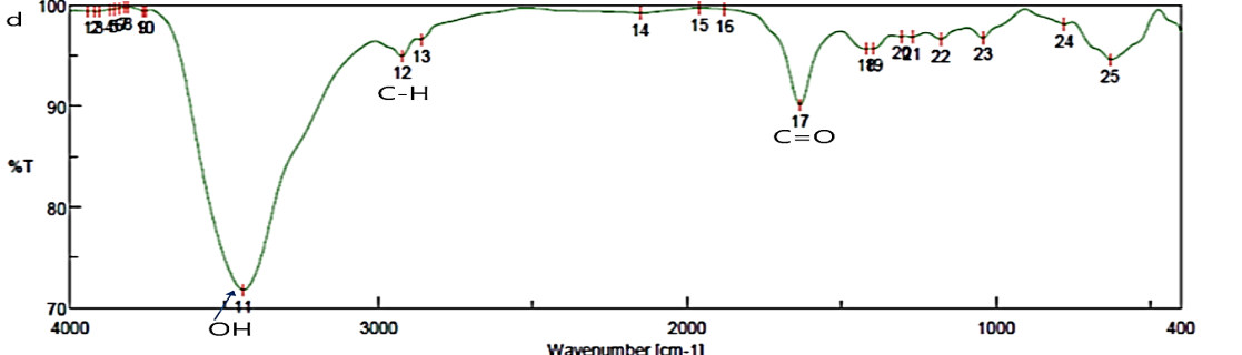 Fig. 2: FTIR spectra of a; total ethanolic leaves extract of JSA, b; JSA AgNPs, c; total ethanolic leaves extract of JSG, d; JSG AgNPs