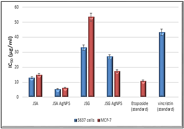 Table 1: IC50 of JSA and JSG ethanolic extracts and their corresponding AgNPs on cell lines; MCF-7 breast cancer and 5637 bladder cancer and normal keratinocyte (Ha CaT) using selective standard drugs etoposide for (MCF-7) and Vincristine for (5673) cell lines