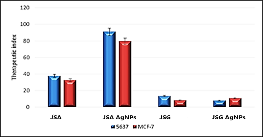 By calculating the therapeutic indices of JSA and JSG and their corresponding AgNPs, all the tested extracts and AgNPS have a good TI but a very high TI of JSA AgNPs toward both cell lines: MCF-7 breast cancer cell line (93.5) and the 5637 bladdetr cell line (81.3). Indicating the effectiveness of JSA AgNPs toward the two cell lines with very low cellular toxicity.