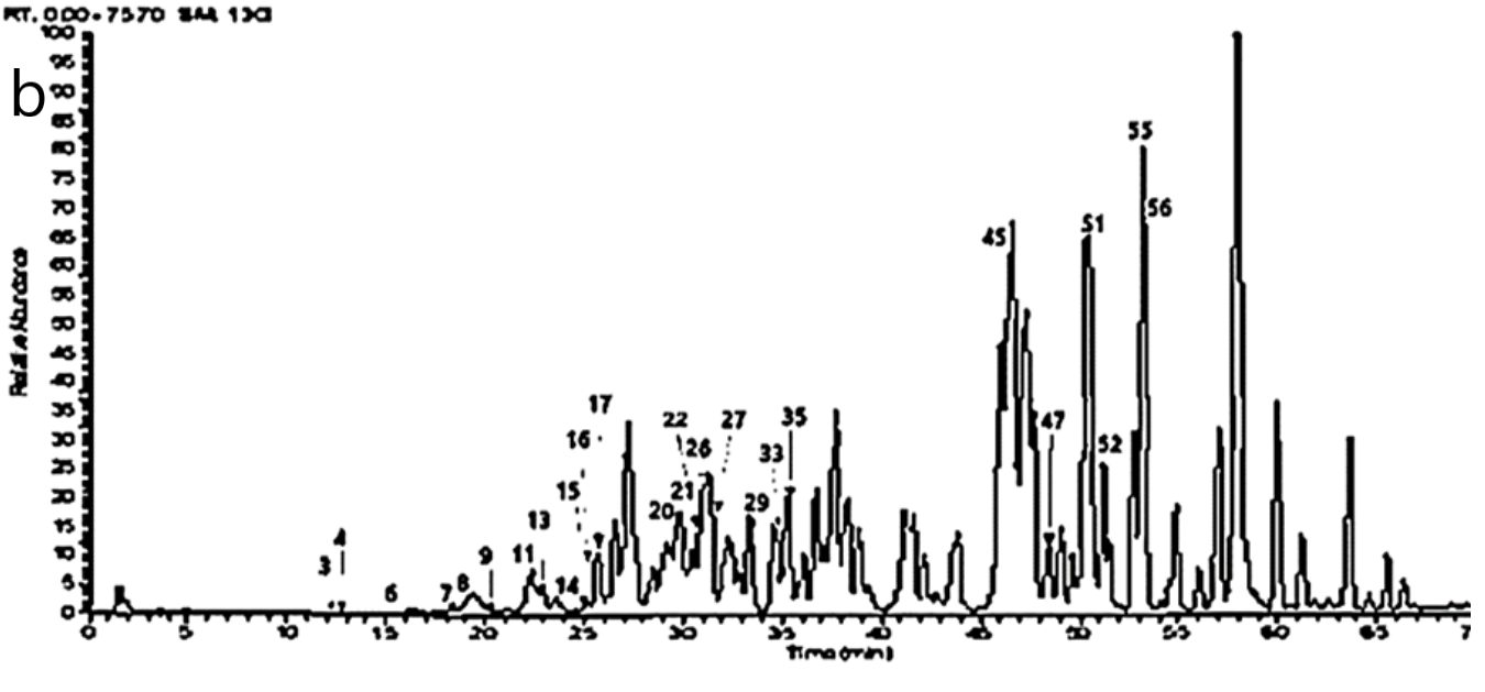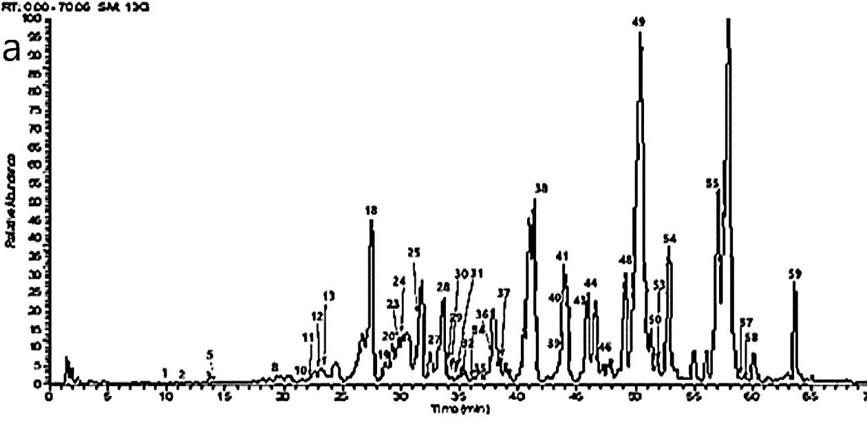 Fig. 4: Total ion chromatogram of ethanolic extracts of leaves of a; JSA and b; JSG