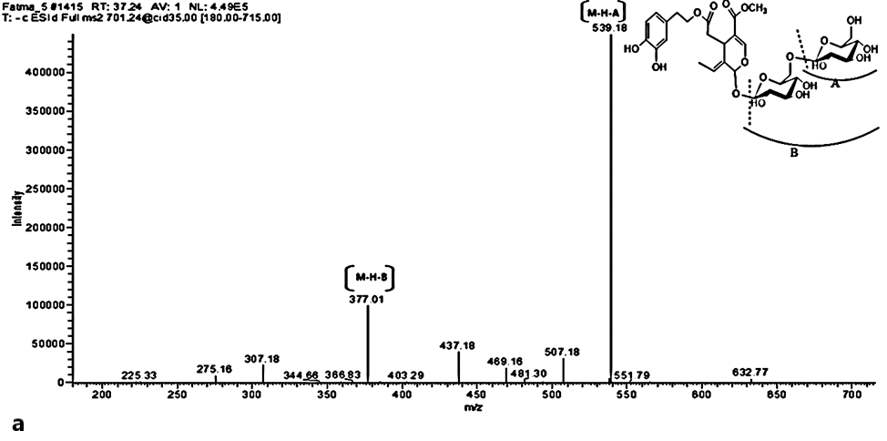 | 36 | 37.01 | + | - | 701 | 539 | 232, 277 | oleuropein hexoside | [62] |