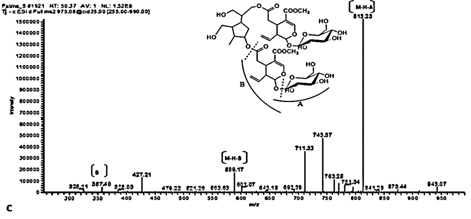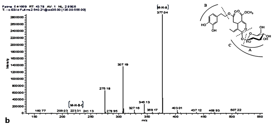 MS spectral interpretation allowed for the identification of 2 lignans, cycloolivil hexoside and cycloolivil peaks 11 and 53 with a corresponding molecular ion [M-H]-of m/z 537 and 375 with their characteristic daughter ions of m/z 195, 179.
