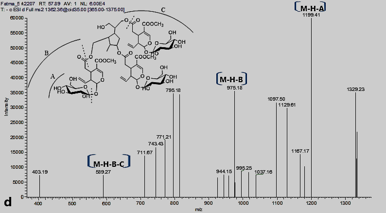 Fig. 6: MS/MS fragmentation pattern of some identified secoiridoid glycosides; a (oleuropein hexoside), b (oleuropein), c (deacyl sambacoside), d (sambacoside A)