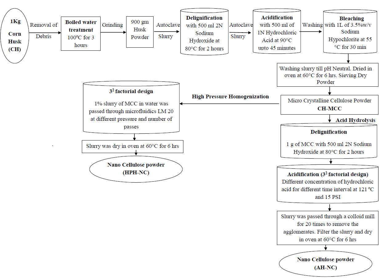 Keywords: Corn husk, Nanocellulose, Acid hydrolysis, High pressure homogenizer, Quality by design, Factorial design