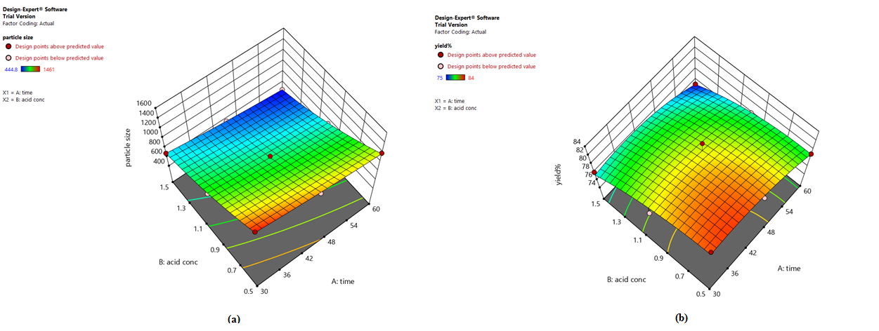 3^2 level factorial design was planned considering the critical parameters of the NC, which were determined by small-volume pre-experiments and evaluated by Mini Tab™ Software. Reaction time and acid concentration for AH and pressure and No of Passes for HPH were selected as independent variables. Dependent variables considered in the factorial design were particle size and yield based on the severity scores of CQAs. The levels of the factors are shown in table 5.