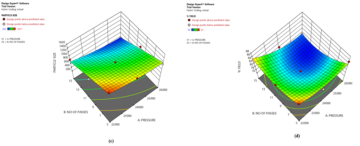Fig. 3: Effect of variables on yield and particle size a) acid concentration and reaction time on mean particle size b) acid concentration and reaction time on yield c) number of passes and pressure on mean particle size d) number of passes and pressure on yield