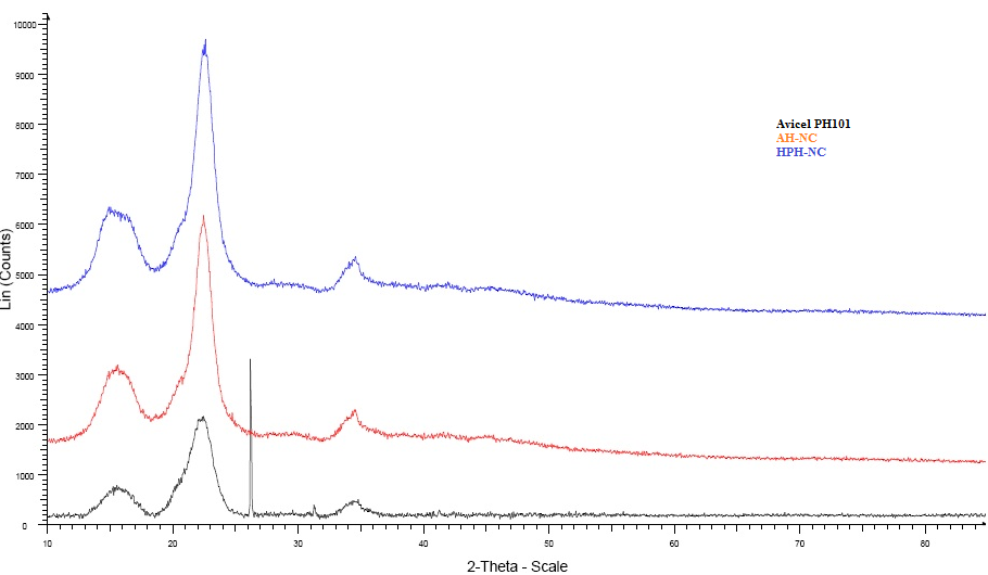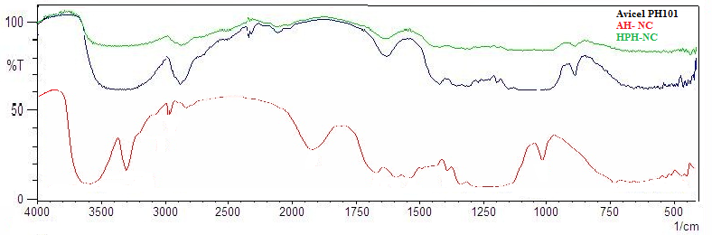 Spectrum of AH-NC, HPH-NC and Avicel PH101 of FT-IR is shown in fig. 4. The FTIR spectra revealed that all finger print peaks for isolated NC are concordant with standard peaks reported in the literature for other celluloses. NC prepared using AH and HPH demonstrated comparable IR spectra with marketed cellulose Avicel PH101.