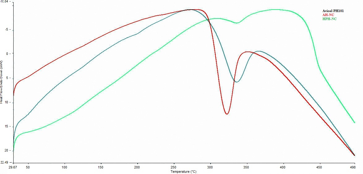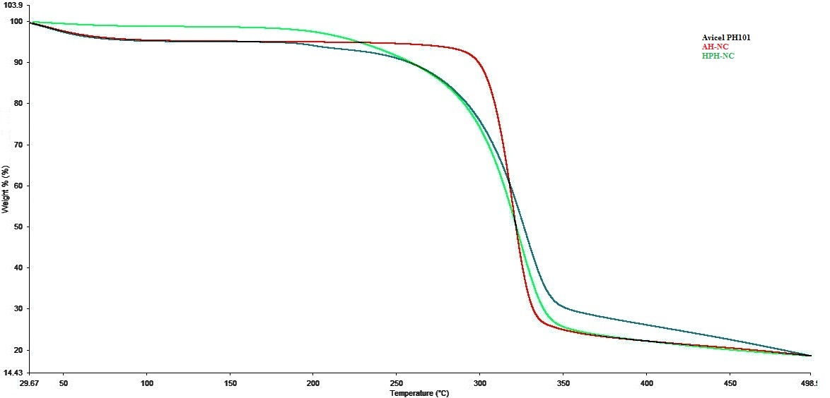 The thermo grams in fig. 5 show that Avicel PH 101, AH-NC and HPH-NC follow similar degradation patterns. As shown in table 7, TGA profiles of Avicel PH 101, AH-NC and HPH-NC are identical with respect to T5%, T50% and W500 (%). T5% and T50% are the temperature for which 5% and 50% of the mass is decomposed respectively, whereas, W500 (%) denotes char yield. Initial weight loss represents evaporation of loose bound free water on the surface and also due to removal of the protective waxes and lignin layers from the fiber. Lower residual char value at 500 °C for AH-NC and HPH-NC indicating lower amounts of residual solids. This could be an indicator for the absence of hemicellulose or lignin [38].
