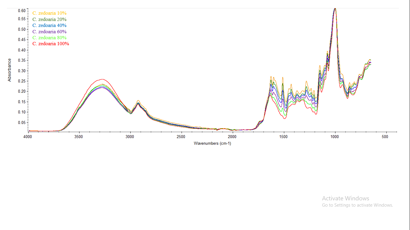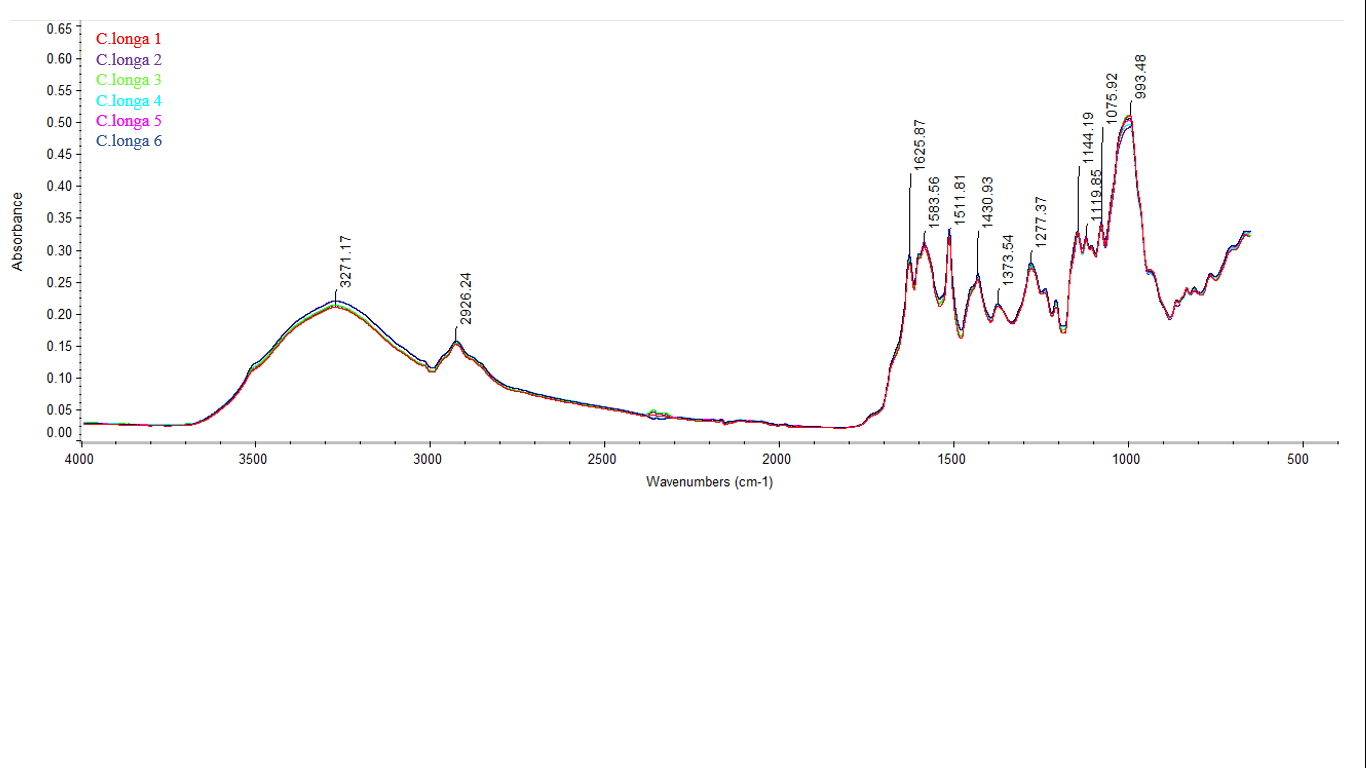 Fig. 2 shows that the IR spectra from six regions in Java Island have high similarities. Fig. 3 shows the IR spectra between Curcuma longa, Curcuma xanthorrhiza, and Curcuma zedoaria are significantly different in 1650-1200 cm-1. The different curcuminoid content of those three species cause variations in their peak positions and intensities. Interpretation of functional groups from each peak is described in table 1.