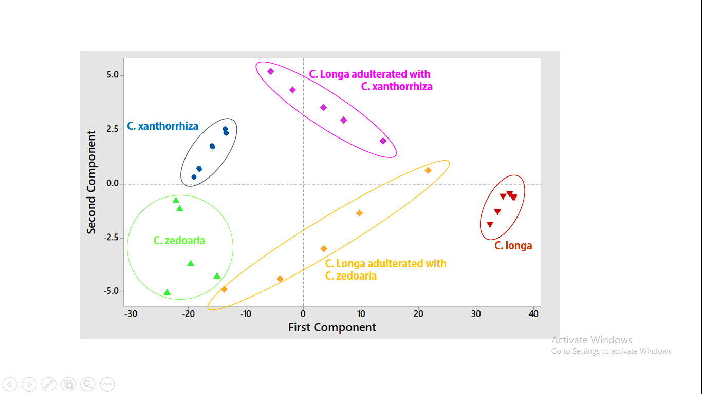 Fig. 5: PCA score plot of Curcuma longa, Curcuma xanthorrhiza, Curcuma zedoaria, and the adulterated turmeric powder