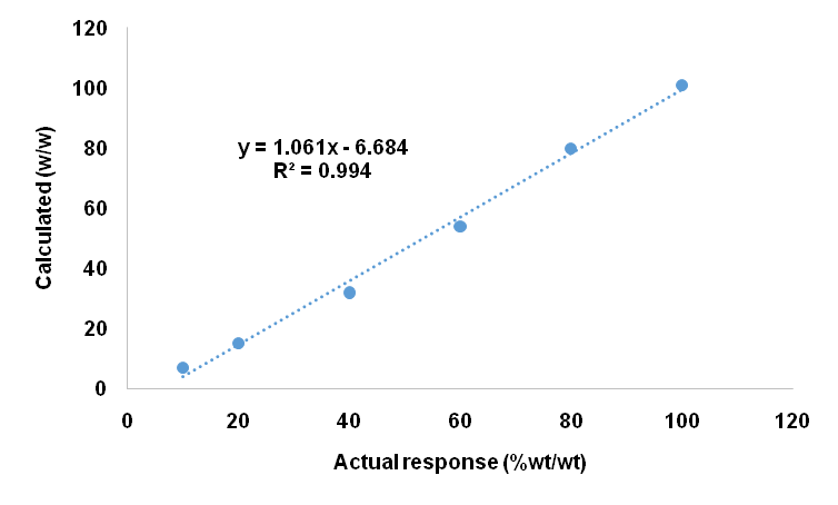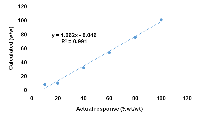 PLS regression model for Curcuma zedoaria in Curcuma longa and Curcuma xanthorrhiza in Curcuma longa were calibrated and validated resulting in high accuracy and precision so that they could be used to quantitate Curcuma zedoaria and Curcuma xanthorrhiza in turmeric powder. Fig. 6 shows the correlation between the actual and the calculated responses of the Curcuma zedoaria in a binary mixture with Curcuma longa with the equation of y = 1.0616x–6.6849 and the R2 value was 0.9944. Fig. 7 shows the correlation between the actual and the calculated responses of the Curcuma xanthorrhiza in a binary mixture with Curcuma longa with the equation of y = 1.0622x–8.0466 and the R2 value was 0.9917. The result shows that a good relationship was obtained between the actual and calculated responses of both models.