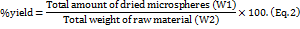 The production yields of mucoadhesive microspheres of all formulation batches were evaluated using the weight of the final dried product (W1) with respect to the initial total weight of the raw materials used for the preparation of microspheres (W2) and percent production yields according to the equation 2 cited below [23-25].