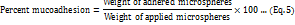 Mucoadhesive property of Microspheres was evaluated by In vitro wash-off test. The rats were sacrificed by cervical dislocation. The abdomen was opened and the stomach excised [37]. A 1-cm by 1-cm piece of rat stomach mucosa was cut and tied on a glass slide (3-inch by 1-inch) with thead. Approximately 100 microspheres were spread onto the wet rinsed tissue specimen and hanging prepared slide onto the grooves of a USP tablet disintegrating test apparatus. After that, the apparatus was switched on and the tissue specimen was given up and down movements for 10 h in a beaker having simulated gastric fluid (pH 1.2). The microspheres left behind on the surface of the gastric mucosa were counted after 10 h and the % mucoadhesion was calculated by the formula shown in Equation 5 [38, 39].