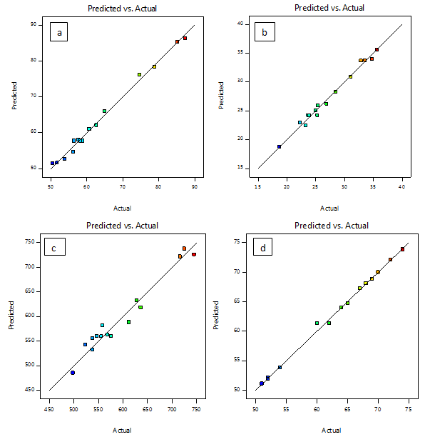 Fig. 1: Linear correlation plots between the actual vs predicted. a)-entrapment efficiency, b)-Q1 h, c)-t90% and d)-mucoadhesion