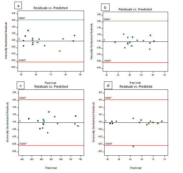 Fig. 2: Showing the scatter of residues vs predicted a)-entrapment efficiency, b)-Q1 h, c)-t90% and d)-mucoadhesion