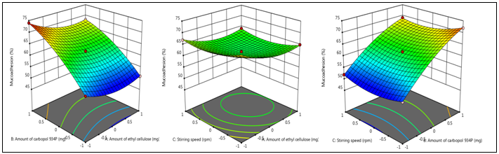 Fig. 6: Thee-dimensional response surface graphs related to mucoadhesion