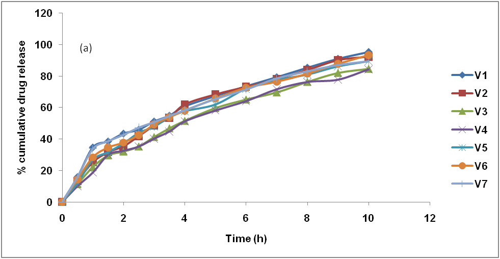 The entrapment efficiency of all batches was varied from 50.45 to 87.32% shown in table 2. The maximum entrapment efficiency was 87.32% of batch V4. It shows entrapment efficiency is increased due to an increase in the concentration of ethyl cellulose, carbopol 934P and increasing stirring speed. The entrapment efficiency is highly depending on the amount of ethylcellulose used, however other two factors such as the amount of carbopol 934P and stirring speed also increases entrapment efficiency, but in lesser extent as compared to the amount of ethyl cellulose. Similar results have been reported in the literature with other drugs [43, 44].