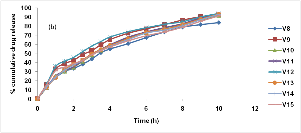 Fig. 7 Drug release profile of batches (a)-V1-V7 and (b)-V8-V15, mean±SD, n = 3