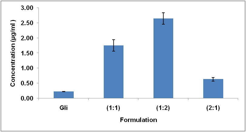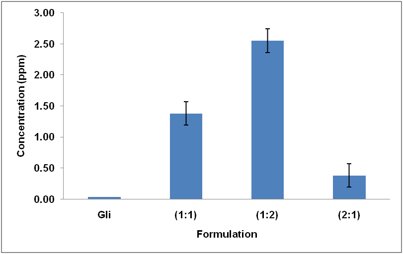 The sample equivalent to 20 mg GCM was placed in vials containing water. The vials were agitated using a mechanical agitator at room temperature and allowed to stand for equilibrations for 24 and 48 h. The samples were filtered through a 0.45 μm membrane filter, diluted with distilled water and analyzed spectrophotometrically at 266 nm [15].